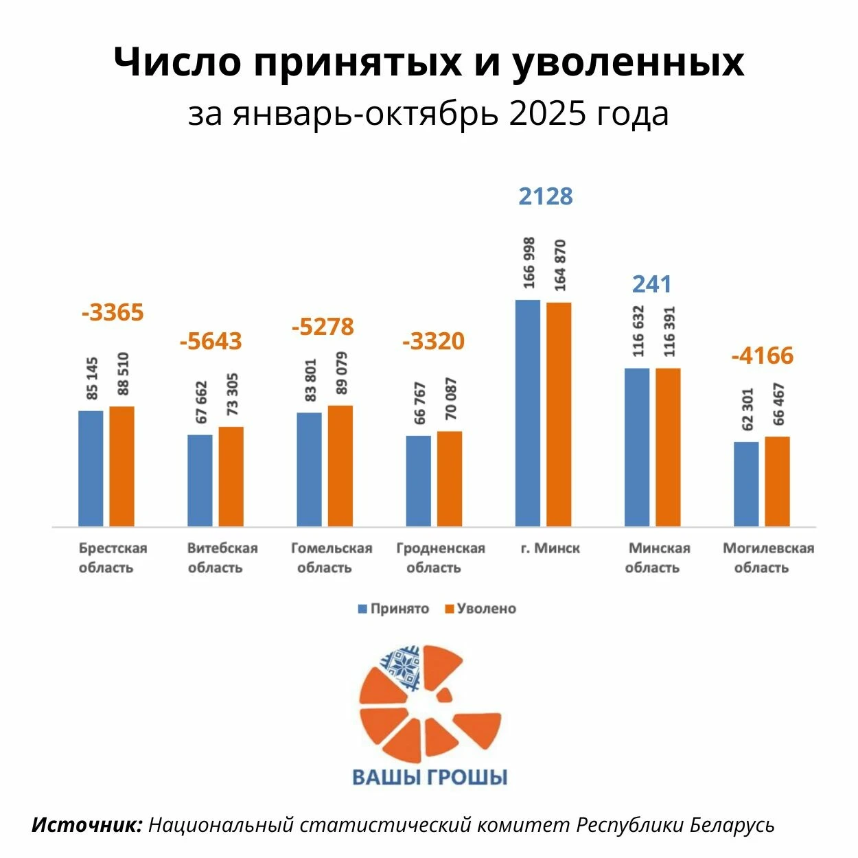Изучим, как происходило передвижение рабочей силы на рынке труда в последнее время. По итогам января–октября 2025 года Минск оказался нетто-получателем: +2 128 занятых (166 998 принято против 164 870 уволено). Минская область — тоже в небольшом плюсе: +241. А вот все остальные регионы ушли в минус: самый большой отток мы видим из Витебской области (–5 643 человека), следом в антирейтинге расположена Гомельская область (–5 278 человек), в середине Могилевщина (–4 166 человек), чуть получше дела в Брестской (–3 365 человек) и Гродненской (–3 320 человек) областях.