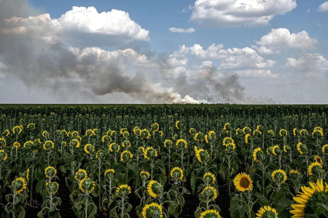 8 июля, Запорожская область. Над полем подсолнухов поднимается дым после российского обстрела