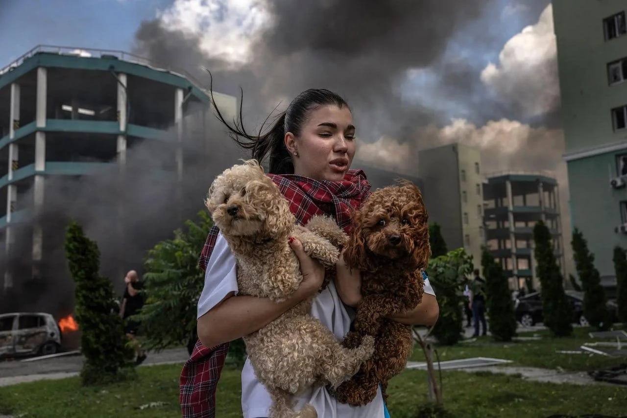 24 июля, Харьков. Девушка выбегает из дома, держа на руках домашних животных после российского удара КАБами