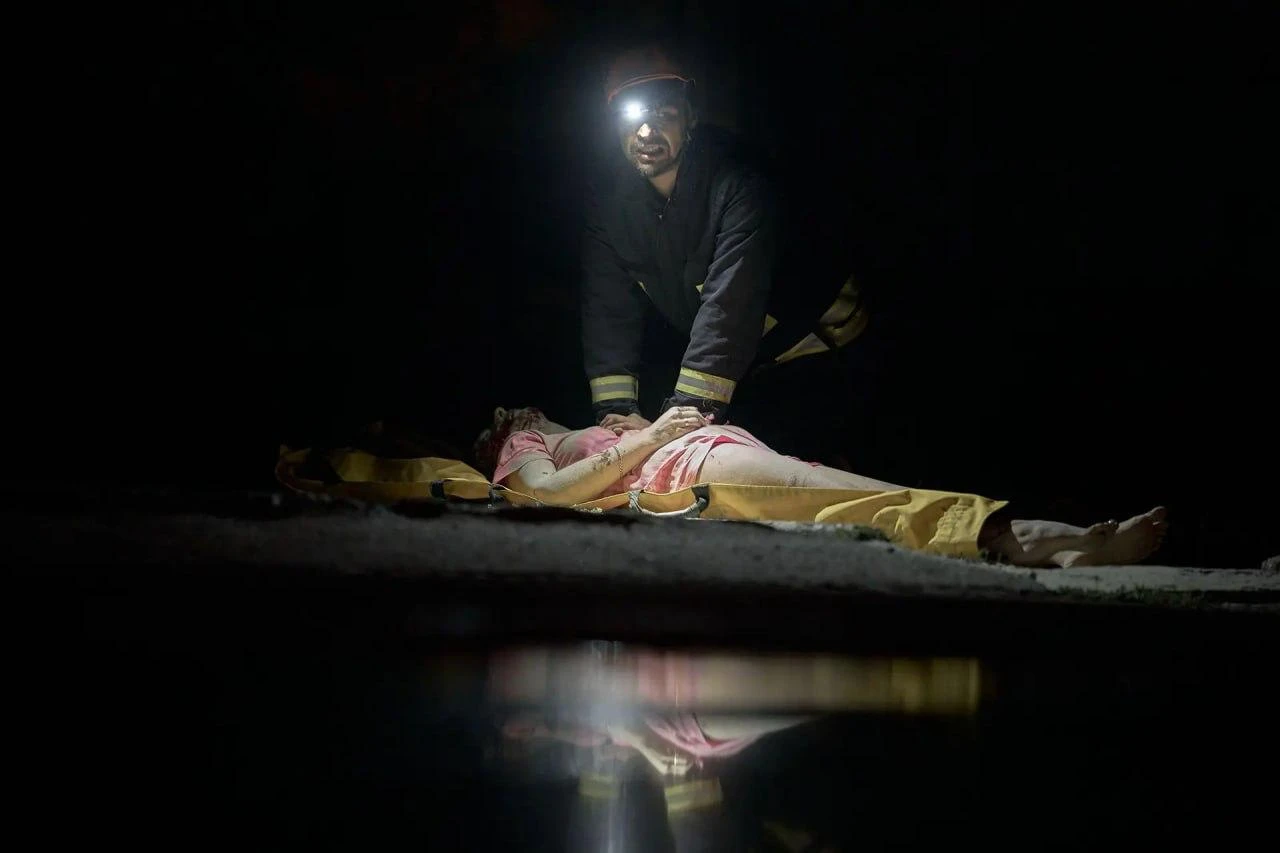 28 августа, Киев. Спасатели оказывают первую помощь пострадавшей от обстрела женщине